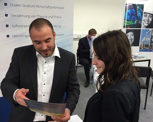 (Foto: Auf der Messe „Tag des dualen Studiums“ stellt Adam sein Unternehmen vor und erzählt aus dem Berufsalltag)